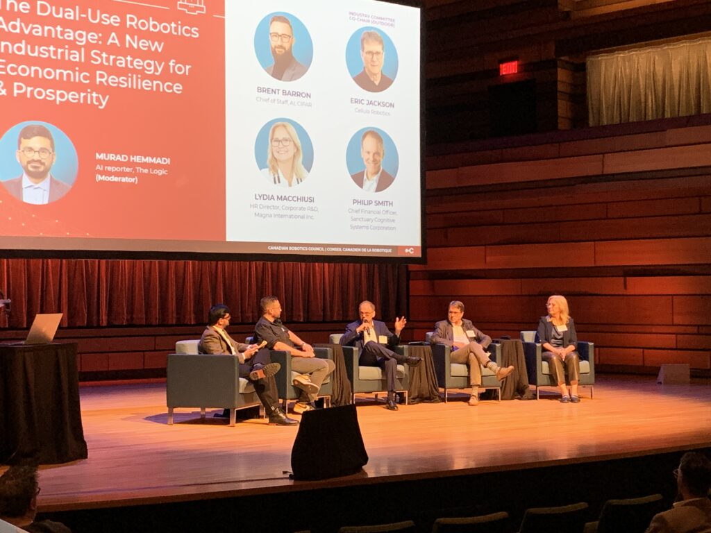 Murad Hemmadi, AI reported for The Logic and host of the panel discussion, set the stage by identifying that, “Canada is about to spend, I believe the technical term is, absolutely gobs of money on defence in a way we haven’t in a very long time,” which opened the floor for panel participants Brent Barron, chief of staff for AI from CIFAR, Eric Jackson, president of Cellula Robotics, Lydia Macchiusi, HR director, corporate R&D for Magna International Inc. and Philip Smith, chief financial officer for Sanctuary Cognitive Systems Corporation, to share how robotics companies can shift their processes to facilitate dual-use robotics and capitalize on the increased spending.